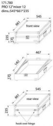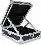 I denne flykoffert kan mikser opp til 12U høyde plasseres og transporteres. Skrå stilling av profilskinnene for optimal ytelse med mikseren, kontrolleren osv. Kryssfiner med svart belegg, aluminiumsprofiler, stålbelagte kulehjørner og hengsler med kroker. Flykofferten er pent ferdig og leveres med to fjærbelastede håndtak og en sommerfugllås. - Skråstilt posisjon av rackskinner for en mikser, kontroller eller lignende.
