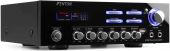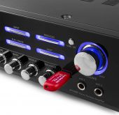 The Fenton AV120BT is a versatile 2x 60W HiFi amplifier with dynamic screen display that leviers the perfect sound for your home theatre system. Easy to connect and use with standard RCA audio inputs on the rear for connecting your TV or other device via the AUX cable. Featuring a USB port, BT, Bass/Treble and Echo control, two microphone inputs, forced cooling, etc. Also perfect for applications as Karaoke and background music. - 2x 60W HiFi amplifier