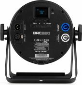 The beamZ BAC3 series is series of compact aluminium LED ProPars, developed according to the latest LED technology. The combination of high-power LEDs built into an attractive cast aluminium housing ensures highly efficient heat dissipation. This eliminates the need for an internal fan, making this Par absolutely silent in operation. The OLED display with 4 button LED menu allows for easy access to the functions including DMX, master/slave, sound activation and the stand alone function. Equipped with P-Con in/out and XLR 3-pin in/out connectors for daisy chaining multiple units together. Magnet in front for optional accessories: Filter 40° (150.832), Barndoor (150.833)