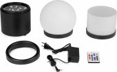 The Helios kit is a set consisting of an indoor/outdoor uplight unit with built-in battery and, in addition to an attachable finishing ring, a number of decorative set up units, including a sphere and a tube effect. These decorative attachments can easily be mounted onto the uplight using a magnetic closure. The uplight is equipped with 6x 15W high efficiency RGBWA-UV LEDs to create a bright, intense and powerful color spectrum, and can be controlled via wireless DMX or via Wi-Fi (App). When fully charged, this uplight can last up to 15 hours (depending on color and intensity), and the charging time is approximately 8 hours. This uplight is silent, as no fan is used.