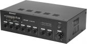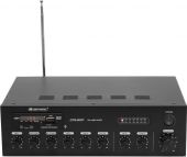 | Power supply: | 230 V AC, 50 Hz Or 24V | | Power consumption: | 120 W | | Output power: | 60 W RMS | | Power connection: | Mains input via IEC connector (M) mounting version power supply cord with safety plug (provided) | | Impedance: | 4 ohms; 8 ohms; 16 ohms; public address systems 100V; Public address systems 70V | | Control: | Bluetooth; IR remote control | | Audio player: | USB + SD + Bluetooth + FM radio | | Circuitry: | Class D | | Controls: | Overload; short-circuit; limiter; overheat | | Connections: | Input: microphone via 1 x 3-pin XLR Input: mic/line via 2 x 6.3 mm jack socket (stereo) mounting version Input: line via 2 x stereo RCA Output: line via 1 x stereo RCA 0.774 V Output: speaker via screw terminal | | Equalizer: | Master: 1 x 2-band tone control | | Music format: | MP3 | | Housing design: | 2 U Desktop console housing | | Dimensions: | Width: 30.3 cm Depth: 22 cm Height: 9.1 cm | | Weight: | 3.28 kg | | Remote control | | | Battery: | 1 x button cell 3.0 V CR2025 lithium manganese built-in |
