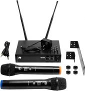 | Type: | Wireless set |  | Protection class: | Protection class III |  | Number of channels: | 2 |  | Frequency range: | 50 - 15000 Hz |  | Range: | Range up to 30m with line-of-sight |  | Frequency band: | UHF 863 - 865 MHz; UHF 823 - 832 MHz |  | Modulation: | FM |  | Frequency selection: | 16 switchable frequencies In 2 groups |  | Weight: | 1.87 kg |  | Receiver |  |  | Power supply: | 100-240 V AC, 50/60 Hz 12V DC 500 mA |  | Power consumption: | Max. 3.1 W |  | Power connection: | Mains input via coaxial power connector (M) power supply cord with AC unit (provided) |  | S/N ratio: | >90 dB |  | THD: | <0.05 % at 1 kHz |  | Housing color: | Black |  | Display type: | Multicolor 4 digit 7-segment LED display |  | Display: | Mute; channel , frequency , AF audio level , RF signal level |  | Control elements: | Power switch, level control per channel |  | Connections: | Input: antenna via 2 x BNC (F) Output: microphone via 1 x 6.3 mm plug (unbal.) Output: microphone via 2 x 3-pin XLR (M) mounting version |  | Material: | Metal |  | Housing design: | Desktop console housing (19") 48.3 cm rack installation possible |  | Mounting depth: | 18.5 cm |  | Dimensions: | Width: 21.1 cm Depth: 14.4 cm Height: 4.2 cm |  | Weight: | 0.970 kg |  | Microphone |  |  | Type: | Hand-held transmitter |  | Power supply: | 3V DC |  | Capsule type: | Dynamic |  | Polar pattern: | Cardioid |  | Battery: | Mignon (AA) (not included) |  | Sensitivity: | -54 dB |  | RF power output: | 10 mW |  | Display: | Frequency , channel , charge status indicator , Mute |  | Switch: | On/off/mute switch |  | Dimensions: | Length: 24.3 cm Diameter: Ø 5.5 cm |  | Weight: | 0.27 kg |                                                                         |       |        |           |     |
