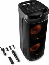 Create the ultimate indoor or outdoor dance fest with the Pulse Party Speaker series, featuring a spectacular beat- synchronized light show across the front and both sides. Thanks to the built-in powerful rechargeable battery, wireless microphone and numerous input options; USB and micro SD card, you can easily sing along to all your favourite songs. It’s also possible to wirelessly connect two Pulse speakers to create an even more powerful stereo sound. When it's time to switch up the scene, the Pulse Party Speaker series is IPX4 water-resistant, so you can take your tunes to the beach or lake. Turn up the fun!