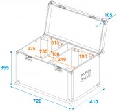 Maximum load: | 50 kg | Aluminum profile frames: | 30 mm | Case handle: | 2 pc/pcs | Stop hinge: | 2 pc/pcs | Lock: | Butterfly lock: 2 pc/pcs | Use of brands: | Branded hardware | Material: | Birch multiplex, 7 mm; birch multiplex | Color: | Black, laminated; dark brown, laminated | Inside dimensions: | 58 cm x 33,5 cm | Device compartment: | 24 cm x 23 cm x 33,5 cm | Middle compartment: | 10 cm x | Dimensions: | Width: 72 cm Depth: 46 cm Height: 41 cm | Weight: | 12,20 kg |     |  |  |  | |