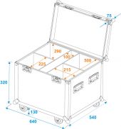 Maximum load: | 100 kg | Aluminum profile frames: | 25 mm | Case handle: | 4 pc/pcs | Stop hinge: | 2 pc/pcs | Lock: | Butterfly lock: 2 pc/pcs | Transport aid: | 4 x castors with 2 locking brakes 4 x built-in stacking trays in the cover | Use of brands: | Branded hardware | Material: | Birch multiplex | Color: | Dark brown, laminated | Device compartment: | 21,5 cm x 22,5 cm x 29 cm | Accessory compartment: | 10 cm x 50 cm x 29 cm | Inside dimensions: | 53 cm x 50 cm x 29 cm | Material thickness: | 6,5 mm | Dimensions: | Width: 62,50 cm Depth: 53,50 cm Height: 51,50 cm | Weight: | 17,75 kg |     |  |  |  | |