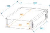 | Maximum load: | 50 kg | | Aluminum profile frames: | 20 mm | | Case handle: | 2 pc/pcs | | Lock: | Butterfly lock: 4 pc/pcs | | Transport aid: | Rubber feet | | Use of brands: | Branded hardware | | Material: | Birch multiplex, 9 mm | | Color: | Dark brown, laminated | | Front panel width: | 19" | | Mounting height: | Approx. 18 cm (4 U) | | Mounting depth: | 265 mm | | Housing design: | 4 U | | Dimensions: | Width: 53 cm Depth: 41 cm Height: 20.5 cm | | Weight: | 7.55 kg |