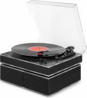 | Product colour | Black | | Playback options | BT streaming, Vinyl | | Speed settings (RPM) | 33, 45, 78 | | Output power | 120W | | Power supply | 100-240VAC 50/60Hz (12V Adapter) | | Dimensions (L x W x H) | 315 x 330 x 105mm (Record player) 288 x 165 x 100mm (Speaker) | | Weight (kg) | 4,60 | | Included accessories | Adapter for singles, Power adapter |