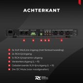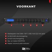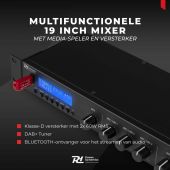 | Product colour | Black | | Playback options | BT 5.0 streaming, USB, DAB+ radio, Line input, Microphone (input) | | Frequency response | 100Hz - 20.000Hz | | THD | <2% | | Signal-to-noise ratio: Mic | >80dB | | Signal-to-noise ratio: Line | >80dB | | Output level: Nominal | 0dBV | | Input connections | 3.5mm Jack, RCA, USB, XLR (3-pin) | | Output connections | RCA, Screw terminal, XLR (3-pin) | | Output channels | 2 | | Output power: RMS | 60W | | Power supply | 100-240VAC 50/60Hz | | Is the item 19"? | Yes | | Dimensions (L x W x H) | 135 x 483 x 45mm | | Weight (kg) | 1,90 | | Included accessories | Remote control (wireless), Power cable | pdf