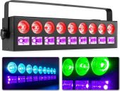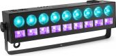 LCB99 er en kompakt 2-i-1 LED Bar utstyrt med 9x 6W RGBW LED-er i kombinasjon med 9x 3W UV LED-er. Denne kombinasjonen sikrer høy lysintensitet og optimal fargeblanding i kombinasjon med UV-lys. Denne LED Bar-en kan operere i moduser som DMX, stand-alone, lydaktivering og master/slave. Følgende funksjoner er tilgjengelige: strobe, hastighet, blink, dimmermoduser og et antall innebygde programmer som aktiveres av musikkens rytme. Enheter kan enkelt kobles sammen (daisy chain) og monteres i truss-strukturer eller brukes som et frittstående effektlys.
