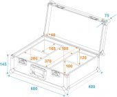 | Aluminum profile frames: | 25 mm | | Carrying handle: | 1 pc/pcs | | Stop hinge: | 2 pc/pcs | | Lock: | Butterfly lock: 2 pc/pcs | | Use of brands: | Branded hardware | | Material: | Birch multiplex, 7 mm | | Color: | Dark brown, laminated | | Device compartment: | 20,5 cm x 16,5 cm x 10 cm | | Accessory compartment: | 10,5 cm x 37 cm x 10 cm | | Inside dimensions: | 59 cm x 39 cm x 12 cm | | Dimensions: | Width: 60 cm Depth: 40 cm Height: 22 cm | | Weight: | 8,00 kg |     |