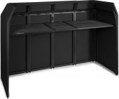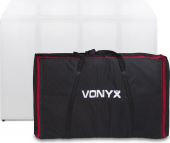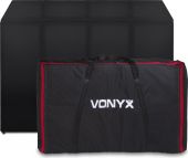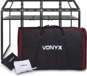 The Vonyx DB5 is a complete professional DJ Booth, 2 meters wide, with a heavy-duty metal DJ-platform and including carrying bags for easy transport and storage. This booth is quick and easy to set up and offers more than enough space for both the DJ and all of his or her equipment. The DB5 is the largest model in the Vonyx range and can handle larger setups thanks to the use of strong, lightweight materials. The stand can be folded into a handy size that can be stored in the included bag. Supplied with a white and black lycra cover. - 6 Sided folding DJ booth