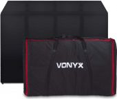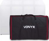 Vonyx DB5 er en komplett profesjonell DJ-bod, 2 meter bred, med en solid metall DJ-plattform og inkludert bærevesker for enkel transport og lagring. Denne boden er rask og enkel å sette opp og tilbyr mer enn nok plass til både DJ-en og alt utstyret hans eller hennes. DB5 er den største modellen i Vonyx-serien og kan håndtere større oppsett takket være bruk av sterke, lette materialer. Stativet kan foldes sammen til en praktisk størrelse som kan lagres i den medfølgende vesken. Leveres med et hvitt og svart lycra-trekk.