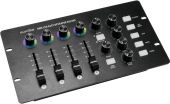 | Power supply: | 100-240 V AC, 50/60 Hz 9V DC 300 mA | | Pin configuration: | Inside + / outside - | | Power consumption: | < 10 W | | IP classification: | IP20 | | Protection class: | Protection class III | | Power connection: | Mains input via coaxial power connector (M) mounting version power supply cord with AC adapter (provided) | | Programs: | Programmable 12 scenes/chases Preprogrammed 12 scenes/chases | | DMX channels: | Output 68 | | DMX output: | 1 x 3-pin XLR (F) mounting version | | Control: | DMX; sound to light via microphone; sound to light via RCA (F) mounting version; stand-alone | | Housing color: | Black | | Color: | Black | | Housing design: | Desktop console housing | | Dimensions: | Width: 26 cm Depth: 14 cm Height: 6.5 cm | | Weight: | 1.17 kg | | Noise classification: | Class 0 (no noise at all) |