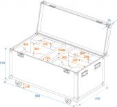 | Maximum load: | 100 kg | | Aluminum profile frames: | 30 mm | | Case handle: | 4 pc/pcs | | Lock: | Butterfly lock: 2 pc/pcs | | Transport aid: | 4 x castors with 2 locking brakes | | Use of brands: | Branded hardware | | Material: | Birch multiplex, 7 mm | | Color: | Dark brown, laminated | | Device compartment: | 38.5 cm x 22 cm x 38 cm | | Inside dimensions: | 56 cm x 43 cm x 46.5 cm | | Middle compartment: | 12 cm x 43 cm x 46.5 cm | | Dimensions: | Width: 96 cm Depth: 47 cm Height: 72 cm | | Weight: | 25.90 kg |
