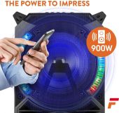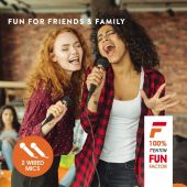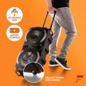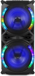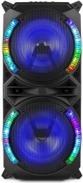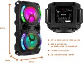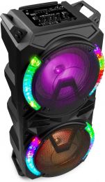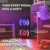 Standing tall, that's the LIVE280 Karaoke Station. This powerful 2x 8" speaker with built-in battery and amplifier comes with 2 microphones. It's also equipped with BT technology to stream your favourite music from your smartphone, tablet or PC and an on-board media player to connect a microSD Card/USB stick for direct music playback. The switchable sound controlled RGB LED lights around the speakers add an amazing effect to any party or event. For those that prefer a more laid back approach there's a remote control included for operating the LIVE280 from a distance.
