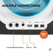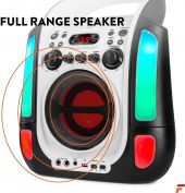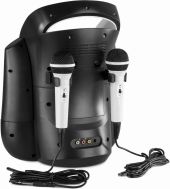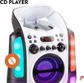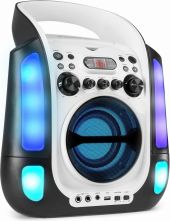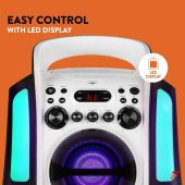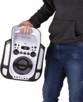 The SBS30 Karaoke System is a portable party station including an impressive multi-colour LED lightshow. The digital echo control will make your voice sound rich, confident, and in tune. The Auto Voice Control (AVC) helps you learn the lyrics of your favourite tunes fast and can also be your backup singer if you forget the words. The SBS30 is also equipped with BT-technology to stream your favourite music and an on-board CD player and USB connection for direct music playback. It’s possible to connect the player to a TV set or projector via the rear video output and if you need more power, just connect the SBS30 to a HiFi system or PA amplifier for the ultimate artist feeling. Including 2 microphones (wired) with echo function to complete the karaoke party!