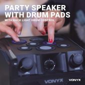 The SBS50B-DRUM wireless speaker with drum machine is a powerful all-in-one unit that turns any indoor space into a dazzling music hall. Simply pair it with your BT-enabled phone or tablet to stream wireless, high fidelity music. Built-in LED lights pulsate to the beat and backlit drum pads create a spectacular atmosphere.