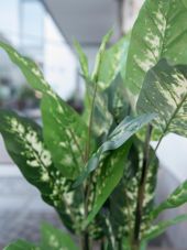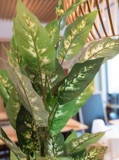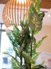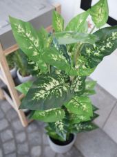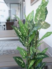 | Trunk: | 3 x artificial trunk | | Standing/fixation: | Gardening pot covered with moss | | Color: | Green/white | | Foliage: | Approx. 71 leaves Material: textile | | Decor style: | Tropics; houseplant | | Dimensions: | Height: 120 cm | | Weight: | 2.35 kg | | Planter | | | Dimensions: | Length: 15 cm Width: 15 cm Height: 12 cm |
