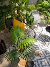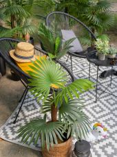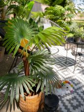 | Trunk: | 1 x palm fiber trunk Length: 25 | | Setup: | Shapeable | | Standing/fixation: | Gardening pot covered with moss | | Color: | Green | | Foliage: | 5 fronts Material: plastic | | Decor style: | Tropics; mediterranean flair | | Season: | Summer; spring | | Dimensions: | Length: 17 cm Width: 17 cm Height: 88 cm | | Weight: | 3.00 kg | | Planter | | | Dimensions: | Height: 15 cm Diameter: Ø 17 cm |