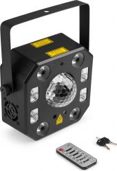 The LightBox5 combines the power of 5 popular effects in 1 fixture. With only 1 light the complete party effect! The combination of the widespread Red/Green laser, together with the coloured LED rays from the rotating jelly ball, the UV light and the PAR effect guarantee a colourful party. The effect comes loaded with a pre-programmed show, including sound active modes. And for more dynamic effects and use with larger lighting systems there is a 18 channel DMX mode giving you control of each built-in light effect, this makes the LightBox5 also very suitable for shows or events.