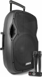 |  | Perfekt til festival eller karaoke. Inkl. 2 trådløse mikrofoner A professional 15" 800W Portable Speaker with remote control, an integrated USB port and SD slot for playing MP3 files. This "all in one" system is equipped with a BT receiver for audio streaming and two UHF wireless microphones operating on different frequencies. Operates via the mains or a 12V built-in rechargeable battery and can therefore also be used outside efficiently. Comes with retractable handle and wheels. At the rear there are two microphone inputs and an echo effect for all microphones, AUX line-input, MP3 control panel, controls for tone adjustment etc. This complete system is indispensable where a good audio reproduction is desired. - 15 800W Portable Speaker