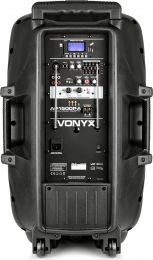 | Product colour | Black | | Playback options | BT streaming, USB, SD | | Speaker type | Active (amplified) | | Output power: Max | 800W | | Battery | 12V - 7Ah | | Frequency response | 50Hz - 19.000 Hz | | Diameter tweeter | 1.4" | | Diameter woofer | 15" | | Magnet weight | 40 oz | | Input connections | 6.3mm Jack, RCA, XLR (3-pin) | | Output connections | RCA | | Frequency handheld microphone(s) | 863.100 MHz, 864.500 MHz | | Supplied features | Speaker pole mount | | Power supply | 220-240VAC 50Hz | | Dimensions (L x W x H) | 360 x 445 x 690mm | | Weight (kg) | 17,30 | | Included accessories | Handheld microphone (wireless), Remote control (wireless) | pdf