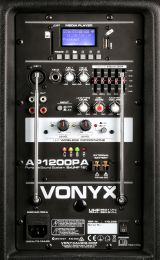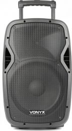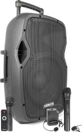 |  | OBS: Vi har kun 2 stk. af denne vare. Praktisk og kompakt lydanlæg med masser af kræfter og mange anvendelsesmuligheder. En profesjonell 12" 600W bærbar høyttaler med fjernkontroll, integrert USB-port og SD-spor for avspilling av MP3-filer. Dette "alt-i-ett" systemet er utstyrt med en BT-mottaker for lydstrømming og UHF trådløs body-pack. Kan drives via strømnettet eller et innebygd oppladbart 12V batteri og kan derfor også brukes effektivt utendørs. Leveres med uttrekkbart håndtak og hjul. På baksiden finnes to mikrofoninnganger og en ekko-effekt for alle mikrofoner, AUX linjeinngang, MP3-kontrollpanel, kontroller for tonejustering osv. Dette komplette systemet er uunnværlig der god lydgjengivelse er ønskelig. - 12 600W Bærbar høyttaler