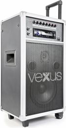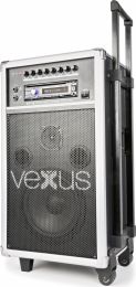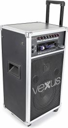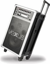 An 8" professional CD/MP3 portable sound system with a built-in 250W amplifier and battery in a mobile housing for (karaoke) parties. Features echo effect, random and intro play, ID-Tag, remote control, telescopic handle and wheels. Easy moveable and can be used everywhere even if there is no mains power present. Ideal for schools, gymnasiums, dance, camping, karaoke parties etc.