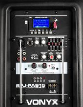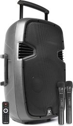 Et profesjonelt 12" 500W mobilt lydsystem med 2 UHF trådløse mikrofoner som opererer på forskjellige frekvenser, fjernkontroll og integrerte USB- og SD-spor for avspilling av MP3. Dette alt-i-ett-systemet kan drives via strømnettet eller et 12V internt oppladbart batteri, og har en 12" hovedhøyttaler og en 1" HF-høyttaler. På baksiden finnes det 2 innganger og en ekko-effekt for kablede mikrofoner, AUX linjeinngang, MP3-kontrollenhet, 5 kontroller for tonejustering osv. Takket være dette spennende systemet kan lokaler og områder fylles med en behagelig lyd.