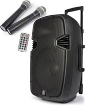 Vonyx SP-PA912 Inkl. 2 Genopladelige batterier 12V 12Ah Perfekt til festivals brug Professionelt mobilt lydanlæg med 2 trådløse UHF håndholdte mikrofoner, der kører på hver sin frekvens og derfor kan benyttes samtidig. På bagsiden har du en komplet MP3 afspiller til digitale musikfiler, med USB-port og SD-kortlæser. Desuden er der 2 indgange for kabelmikrofoner med ekko effekt, AUX line indgang og 5-bånds grafisk equalizer for optimal tilpasning af tonebillede der gør systemet velegnet som karaoke anlæg. Det transportable lydanlæg strømforsynes enten via lysnettet eller det integrerede 12V genopladelige batteri hvilket gør højttaleren ideel som f.eks festival anlæg. Skal du optræde udendørs eller på festival hvor der ikke er adgang til lysnet, er dette system en super god løsning. Selve højttaleren er 2-vejs basrefleks i slagfast ABS letvægts kabinet med stor bas og højtonehorn, stålgitter foran enhederne, teleskophåndtag, hjul og leveres med trådløs fjernbetjening. Perfekt løsning til festival anlæg, zumba, fitness, karaoke anlæg, teater, squaredans og AV. - Indbygget Bluetooth