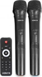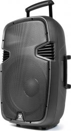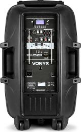 Vonyx SP-PA915 Inkl. 2 Genopladelige batterier 12V 12Ah Perfekt til festivals brug Professionelt mobilt lydanlæg med 2 trådløse UHF håndholdte mikrofoner, der kører på hver sin frekvens og derfor kan benyttes samtidig. På bagsiden har du en komplet MP3 afspiller til digitale musikfiler, med USB-port og SD-kortlæser. Desuden er der 2 indgange for kabelmikrofoner med ekko effekt, AUX line indgang og 5-bånds grafisk equalizer for optimal tilpasning af tonebillede der gør systemet velegnet som karaoke anlæg. Det transportable lydanlæg strømforsynes enten via lysnettet eller det integrerede 12V genopladelige batteri hvilket gør højttaleren ideel som f.eks festival anlæg. Skal du optræde udendørs eller på festival hvor der ikke er adgang til lysnet, er dette system en super god løsning. Selve højttaleren er 2-vejs basrefleks i slagfast ABS letvægts kabinet med stor bas og højtonehorn, stålgitter foran enhederne, teleskophåndtag, hjul og leveres med trådløs fjernbetjening. Perfekt løsning til festival anlæg, zumba, fitness, karaoke anlæg, teater, squaredans og AV. - Indbygget Bluetooth