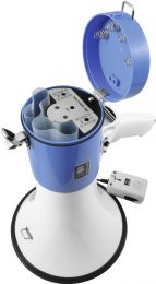 Power supply: | 12 V DC | Power connection: | Battery/battery pack Mains input via Coaxial power connector (M) mounting version | Battery: | 8 x Baby (C) (not included) | Power: | Rated: 25W RMS | Control elements: | Level control | Type of speaker: | Horn | Range: | Range up to 800m | Transport aid: | Shoulder strap | Color: | White; blue | Bell (horn) diameter: | 230 mm | Dimensions: | Length: 39 cm Diameter: Ø 23 cm | Weight: | 1,30 kg |   |