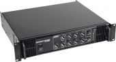 | Power supply: | 230 V AC, 50 Hz | | Power consumption: | 360 W | | Output power: | 180 W RMS | | Power connection: | Fixed power supply cord with safety plug | | Frequency range: | 80 - 16000 Hz | | S/N ratio: | >75 dB microphone >85 dB line | | THD: | <0.5 % at 1 kHz | | Cooling: | Temperature-controlled fan , air flow from front to rear | | Impedance: | Public address systems 100V; 4-16 ohms; Public address systems 70V | | Circuitry: | Class AB | | Controls: | Current limiting; short-circuit; power on/off transient; power on/off transient; Overvoltage; short-circuit | | Status LED: | Power, fault, level meter | | Connections: | Input: microphone via 3 x 6.3 mm plug (unbal.) Input: line via 3 x stereo RCA Output: line via 1 x stereo RCA Output: speaker via screw terminal | | Equalizer: | Master: 1 x 2-band tone control mono | | Material: | Metal | | Color: | Black | | Housing design: | (19") 48.3 cm rack installation 2 U | | Dimensions: | Width: 48.3 cm Depth: 40 cm Height: 8.9 cm | | Weight: | 9.45 kg |     |  |  |