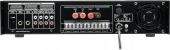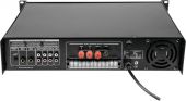| Power supply: | 230 V AC, 50 Hz | | Power consumption: | 360.00 W | | Protection class: | Protection class I | | Output power: | 180 W RMS | | Power connection: | Fixed power supply cord with safety plug | | Device fuse: | 5 x 20 mm, T 2 A fuse replaceable | | Frequency range: | 80 - 16000 Hz | | S/N ratio: | >75 dB microphone >85 dB line | | THD: | <0.5 % at 1 kHz | | Cooling: | Temperature-controlled fan , air flow from front to rear | | Impedance: | Public address systems 100V; 4-16 ohms; Public address systems 70V | | Zone output: | 6 adjustable zones | | Circuitry: | Class AB | | Control elements: | Power switch, Master control, level control per channel, tone control, regular talkover | | Controls: | Current limiting; short-circuit; power on/off transient | | Status LED: | Power, fault, level meter | | Connections: | Input: microphone via 1 x 3-pin XLR/6.35mm jack (F) combination socket (mounting version) Input: microphone via 2 x 6.3 mm plug (unbal.) Input: line via 3 x stereo RCA 0.3 V Output: line via 1 x stereo RCA Output: speaker via screw terminal | | Equalizer: | Master: 1 x 2-band tone control mono | | Material: | Metal | | Color: | Black | | Housing design: | (19") 48.3 cm rack installation 2 U | | Dimensions: | Width: 48.3 cm Depth: 38.5 cm Height: 8.9 cm | | Weight: | 9.00 kg | | Remote control | | | Battery: | 1 x button cell 3.0 V CR2025 lithium manganese built-in | | Audio player | | | Control: | IR remote control | | Audio player: | USB + SD | | Display type: | LCD display | | Music format: | MP3 | | Number of files: | Max. 999 | | Available storage media: | USB devices/SD cards max. 32GB (FAT 32) |