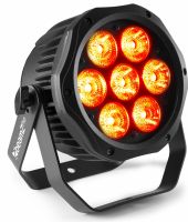BWA410 Aluminum Outdoor LED IP65 Multipar. With 7x 10W high power 4-in-1 RGBW LEDs it is perfect for Lighting up a building or any outdoor surface. Water resistant to IP65 specification. Includes four button LED display and water proof XLR connectors. A double yoke ensures the product can be mounted anywhere the user desires. No fan - heat is dissipated via the aluminum housing.