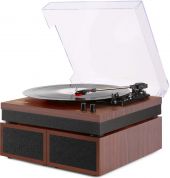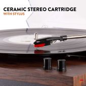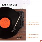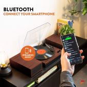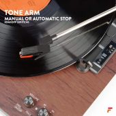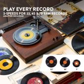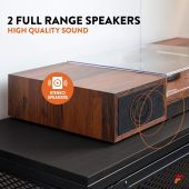 Den Fenton RP165 platespilleren med innebygd forsterker er elegant enkel i designet. Lytt til dine vinylplater med optimal lyd ved å justere volumet på de to inkluderte høyttalerne. Disse doble stereo 50 watt høyttalerne spiller musikk fra enten en 3-hastighets platespiller (33 1/3, 45, 78 RPM) eller innebygd BT-teknologi for å trådløst strømme musikk fra enhver BT-aktivert enhet. - Innebygd stereoforsterker