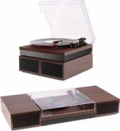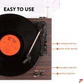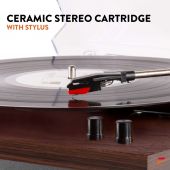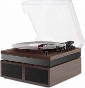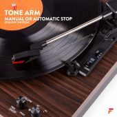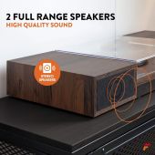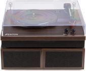 Fenton RP165 platespilleren med innebygd forsterker er elegant enkel i designet. Lytt til dine vinylplater med optimal lyd ved å justere volumet på de to inkluderte høyttalerne. Disse doble stereo 50 watt høyttalerne spiller musikk fra enten en 3-hastighets platespiller (33 1/3, 45, 78 RPM) eller innebygd BT-teknologi for å trådløst strømme musikk fra enhver BT-aktivert enhet. - Innebygd stereoforsterker