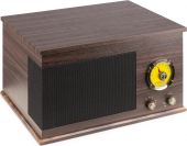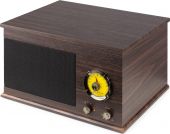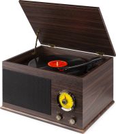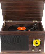 Lytt til din favorittvinyl med denne autentiske vintage-design platespilleren, komplett med en mørk trefiner. Denne allsidige vinylplatespilleren støtter 3 avspillingshastigheter (33 1/3, 45 og 78 RPM), som gjør det mulig å spille nesten alle vinylplater. Den har innebygde høyttalere, AUX-utgang og innebygd FM-radio mottaker for å stemme inn på din favoritt radiostasjon. Denne platespilleren har alle de moderne funksjonene du forventer; en integrert BT-mediaplayer for trådløs musikkstrømming, nostalgisk gul bakgrunnsbelysning og en automatisk stoppfunksjon. Med en retro stil og moderne, høykvalitets lyd, vil denne fantastiske platespilleren garantert bli det mest iøynefallende midtpunktet i ethvert rom. Bruk USB-porten for å konvertere vinylen din til MP3 via PCen din med medfølgende programvare.