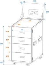 | Maximum load: | 100 kg | | Aluminum profile frames: | 30 mm | | Case handle: | 4 pc/pcs | | Lock: | Butterfly lock: 4 pc/pcs | | Transport aid: | 4 x castors with 2 locking brakes | | Material: | Plywood multi-layer glued, 9 mm | | Color: | Black, laminated | | Compartment dimensions: | 55.5 cm x 54 cm x 21 cm 55.5 cm x 54 cm x 13 cm 55.5 cm x 54 cm x 30 cm | | Table console: | 58 cm x 100 cm | | Dimensions: | Width: 59 cm Depth: 66 cm Height: 115 cm | | Weight: | 72.35 kg |   |