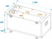 | Maximum load: | 100 kg | | Removable covers: | 1 pc/pcs | | Aluminum profile frames: | 25 mm | | Case handle: | 4 pc/pcs | | Lock: | Butterfly lock: 4 pc/pcs | | Transport aid: | 4 x castors with 2 locking brakes | | Use of brands: | Branded hardware | | Material: | Plywood multi-layer glued; birch multiplex | | Color: | Dark brown, laminated | | Device compartment: | 127 cm x 7 cm x 79.5 cm | | Inside dimensions: | 136 cm x 35 cm x 79.5 cm | | Width: | Maximum: 127 cm Minimum: 112 cm | | Dimensions: | Width: 140 cm Depth: 39 cm Height: 98.5 cm | | Weight: | 41.70 kg |