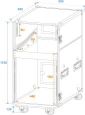 | Maximum load: | 100 kg | | Aluminum profile frames: | 22 mm | | Carrying handle: | 4 pc/pcs | | Lock: | Butterfly lock: 5 pc/pcs with shut-off function | | Transport aid: | 4 x castors with 2 locking brakes | | Material: | Plywood multi-layer glued, 9 mm | | Color: | Black, laminated | | Front panel width: | 19" | | Mounting height: | Front approx. 71 cm (16 U) Front approx. 18 cm (4 U) Top approx. 35.5 cm (8 U) | | Mounting depth: | 470 mm | | Dimensions: | Width: 56 cm Depth: 57.5 cm Height: 121.5 cm | | Weight: | 36.70 kg |