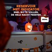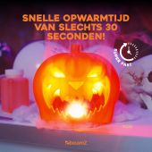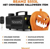 Amaze trick-or-treaters and other guests with this traditional Halloween icon elevated by a spine-chilling new twist. With this unique Halloween pumpkin, you can create a unique spooky display in combination with the included beamZ S553L Smoke Machine. The colour-changing LED lights on the front of the smoke machine (red/green/blue) shine from the inside of the pumpkin through the carved cutouts. In combination with the smoke, this gives a mesmerizing spectacle. Securing the pumpkin to the smoke machine is a breeze with its effortless 1-click connection. Once connected, brace yourself for a bone-chilling experience as the built-in speaker emits terrifying sounds. Don't miss out on this essential addition to your Halloween setup!