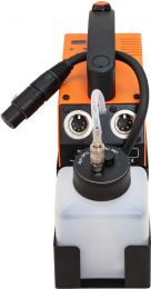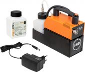 | Power supply: | 12V DC | | Power consumption: | 200 W | | Power connection: | Battery/battery pack Mains input via coaxial power connector (M) mounting version power supply cord with AC adapter (provided) | | Battery pack type: | 1 x lead 12 V, 3400 mAh, | | Battery pack: | Battery operation up to 0.5h depending on program used | | Warm-up time: | 1 sec | | Tank capacity: | 0.25 l | | Fluid consumption: | Approx. 1.5 ml/min - 6 ml/min | | DMX input: | 1 x 5-pin XLR (M) mounting version | | Control: | Stand-alone; wireless remote control (optional); wired remote control (optional); DMX | | Operating principle: | Vaporizing fog machine | | Display type: | OLED display | | Color: | Black | | Dimensions: | Width: 7.9 cm Depth: 20.3 cm Height: 16.3 cm | | Weight: | 4.51 kg | | Noise classification: | Class 2 (slight noise) |