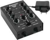| Power supply: | 100-240 V AC, 50/60 Hz 12V 500 mA | | Pin configuration: | Inside + / outside - | | Power consumption: | 6.00 W | | Protection class: | Protection class III | | Power connection: | Mains input via coaxial power connector (M) mounting version power supply cord with AC adapter (provided) | | Frequency range: | 20 - 20000 Hz | | S/N ratio: | >85 dB | | THD: | <0.5 % at 1 kHz | | Housing color: | Black | | Control elements: | Crossfader | | Status LED: | Power | | Connections: | Input: line via 2 x stereo RCA Input: microphone via 1 x 6.3 mm plug (unbal.) Output: master via 1 x stereo RCA Output: rec. via 1 x stereo RCA Output: headphones via 1 x 6.3 mm jack socket (stereo) mounting version | | Channels: | Input chanel: 2 x stereo via RCA, channel control via rotary dial, 2-band tone control EQ Microphon chanal: 1 x mono via jack, channel control via rotary dial Master output: 1 x stereo via RCA, channel control via rotary dial Headphones output: , channel control via rotary dial | | Housing design: | Desktop console housing | | Dimensions: | Width: 10 cm Depth: 16.5 cm Height: 6 cm | | Weight: | 0.50 kg |