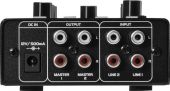 Input chanel: 1 x stereo with line-player switch via RCA or player, channel control via rotary dial, 2-band tone control EQ Input chanel: 1 x stereo via RCA, channel control via rotary dial, 2-band tone control EQ Input chanel: 1 x mono via jack, channel control via rotary dial Master output: , channel control via rotary dial Headphones output: , channel control via rotary dial