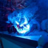 Halloween dekoration - KOMPLET SÆT! Halloween Græskar Røgmaskine med uhyggelige lydeffekter fx spøgelses latter og grin kombineret med røg og LED lyseffekter. Inkl. Trådløs fjernbetjening og 1 liter røgvæske. Set consisting of: 1 x Pumpkin Head with Smoke Machine Read more 1 x FSMF1E-G Smoke Fluid 1L Standard Green Read more