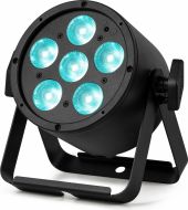 | Product colour | Black |  | Light source | 4-in-1 LED |  | Colours | Red, Green, Blue, White |  | LED power (single LED) | 8W |  | Quantity of LEDs | 6 |  | Beam angle | 20° |  | Field angle | 45° |  | Illuminance | 6.559 lx @ 1m |  | Flash rate per second | 0 - 15Hz |  | DMX channels | 4, 6, 8, 9 |  | DMX connection | 3-pin XLR |  | Modes | Automatic programs, DMX |  | IP rating | IP20 |  | Cooling | Convection |  | Display | oLed |  | Power plug | P-Con |  | Power consumption | 0.724 - 0.358A |  | Power supply | 100-240VAC 50/60Hz |  | Dimensions (L x W x H) | 130 x 130 x 100mm |  | Weight (kg) | 1,60 |  | Included accessories | Remote control (wireless), Mounting bracket, Power cable |