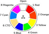 Color wheel with 8 dichroic filters plus open half colors selectable, Rainbow effect with adjustable speed in both directions