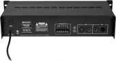 | Power supply: | 230 V AC, 50 Hz | | Power consumption: | 240 W | | Output power: | 120 W RMS | | Power connection: | Fixed power supply cord with safety plug | | Frequency range: | 60 - 16000 Hz | | S/N ratio: | >90 dB | | THD: | <0,5 % at 1 kHz | | Impedance: | 4-16 ohms; Public address systems 100V; Public address systems 70V | | Circuitry: | Class AB | | Controls: | Softstart; overheat; overload; short-circuit; DC voltage | | Status LED: | Level meter, power, fault, clip | | Connections: | Input: line via 1 x 6.3 mm jack socket (mono) mounting version Input: line via 1 x 3-pin XLR 0,8 V Output: line via 1 x 6.3 mm jack socket (mono) mounting version Output: line via 1 x 3-pin XLR | | Housing design: | (19") 48.3 cm rack installation 2 U | | Dimensions: | Width: 48,3 cm Depth: 38,5 cm Height: 9,2 cm | | Weight: | 5,35 kg |