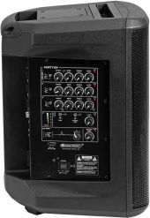 | Power supply: | 100-240 V AC, 50/60 Hz | | Power consumption: | Max. 220 W | | Protection class: | Protection class I | | Power connection: | Mains input via IEC connector (M) mounting version (provided) Battery/battery pack | | Cable length: | 1,5 m detachable | | Device fuse: | 5 x 20 mm, T 3,15 A fuse replaceable | | Battery pack type: | 1 x lithium ion 22,2 V, 4400 mAh, 97,68 Wh | | Battery pack: | Battery operation up to 6,5h at 50% volume Battery operation up to 3,5h at 100% volume Recharging time 4h | | Power: | 120W RMS | | Number of channels: | 4 | | Frequency range: | 45 - 18000 Hz | | Max. SPL: | 114 dB | | DSP: | Digital signal processor 96kHz, 24 bit | | DSP presets: | FLAT; DJ; LIVE | | Control: | Bluetooth | | Bluetooth: | Version: 5 with stereo link (TWS) | | Bluetooth device name: | OMNITRONIC PORTY-8A | | Range: | Bluetooth: range up to 20m | | Frequency band: | UHF 863 - 865 MHz | | Housing color: | Black | | Attachment system: | Dual flange: Ø 35mm | | Circuitry: | Class D | | Control elements: | Power switch, Input sensitivity switch, Master control, level control per channel, echo effect control; connect | | Connections: | Input: mic/line via 3 x 3-pin XLR/6.35mm jack (F) combination socket (mounting version) Input: line via RCA (F) mounting version Input: line via 3.5 mm jack (stereo) mounting version Output: line via 3-pin XLR (M) mounting version | | Channels: | Input chanel: 3 x mono with Mic-Line-Hi.Z. switch via Combination socket (XLR/jack), channel control via rotary dial, 2-band tone control EQ | | Input channels: | 1 x stereo via RCA or jack plug or Bluetooth, channel control via rotary dial | | Speaker: | Woofer 8" with ferrit magnet 8 x compression tweeter highs 1,35" with ferrit magnet | | Type of speaker: | Wireless PA system | | Carrying handle: | 1 pc/pcs | | Material: | Plastic | | Dimensions: | Width: 29 cm Depth: 26,3 cm Height: 39,3 cm | | Weight: | 8,65 kg |